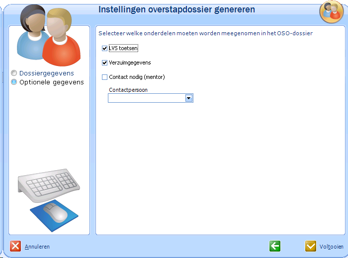Met de eerste drie opties wordt de wizard ‘Instellingen overstapdossier genereren’ geopend.